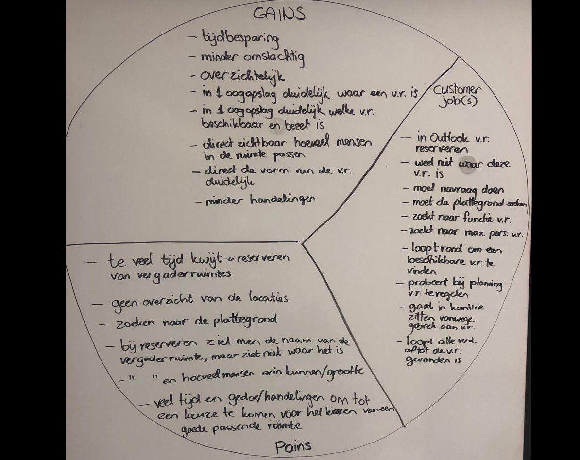 For this assignment, a little version of the SCQA steps were needed, so it was mapped out what the pains and gains were about the meeting rooms within the company. This time there isn’t a questionnaire necessary, because of a personal observation during this semester.